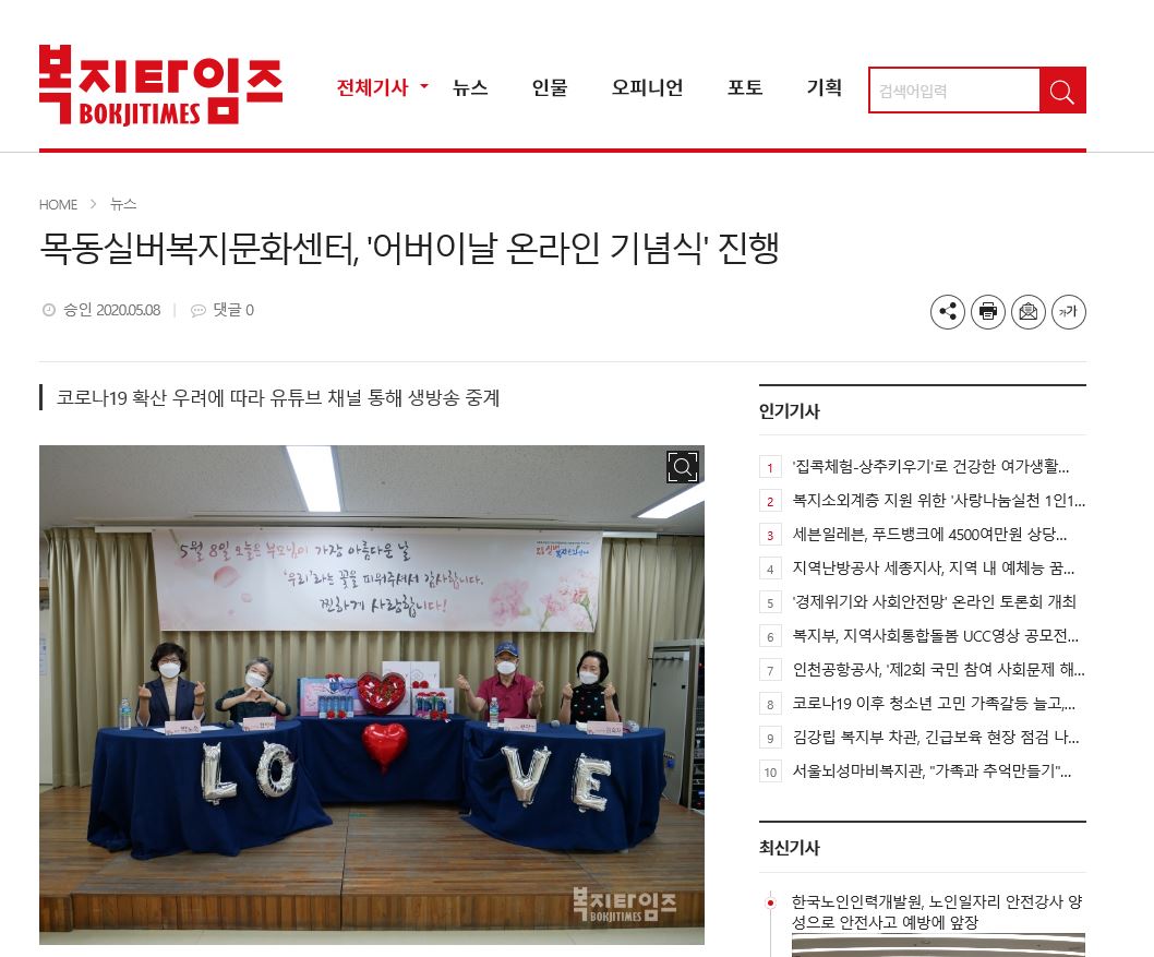 [언론보도] 2020.05.08._복지타임즈 목동실버 어버이날 온라인 기념식 진행