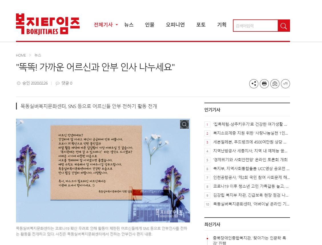 [언론보도] 2020.02.26._복지타임즈 똑똑! 가까운 어르신과 안부인사 나누세요