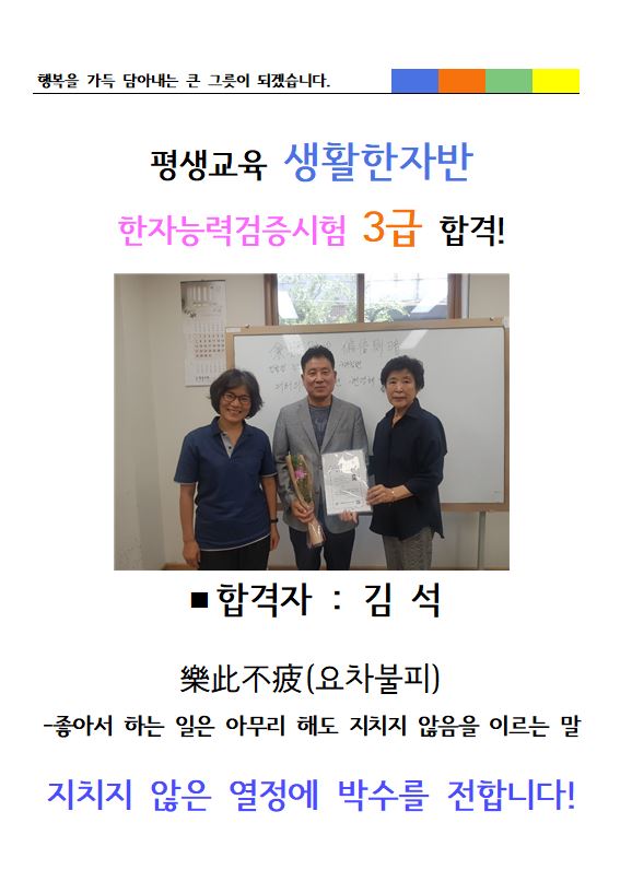 생환한자반 어르신 한자능력검증시험 3급 합격!