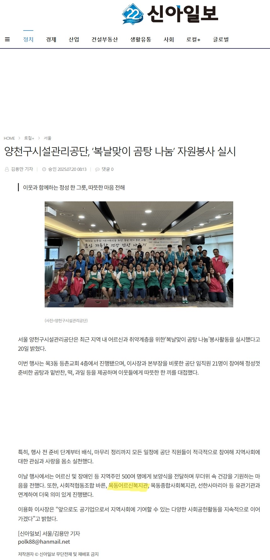 양천구시설관리공단, ‘복날맞이 곰탕 나눔’ 자원봉사 실시