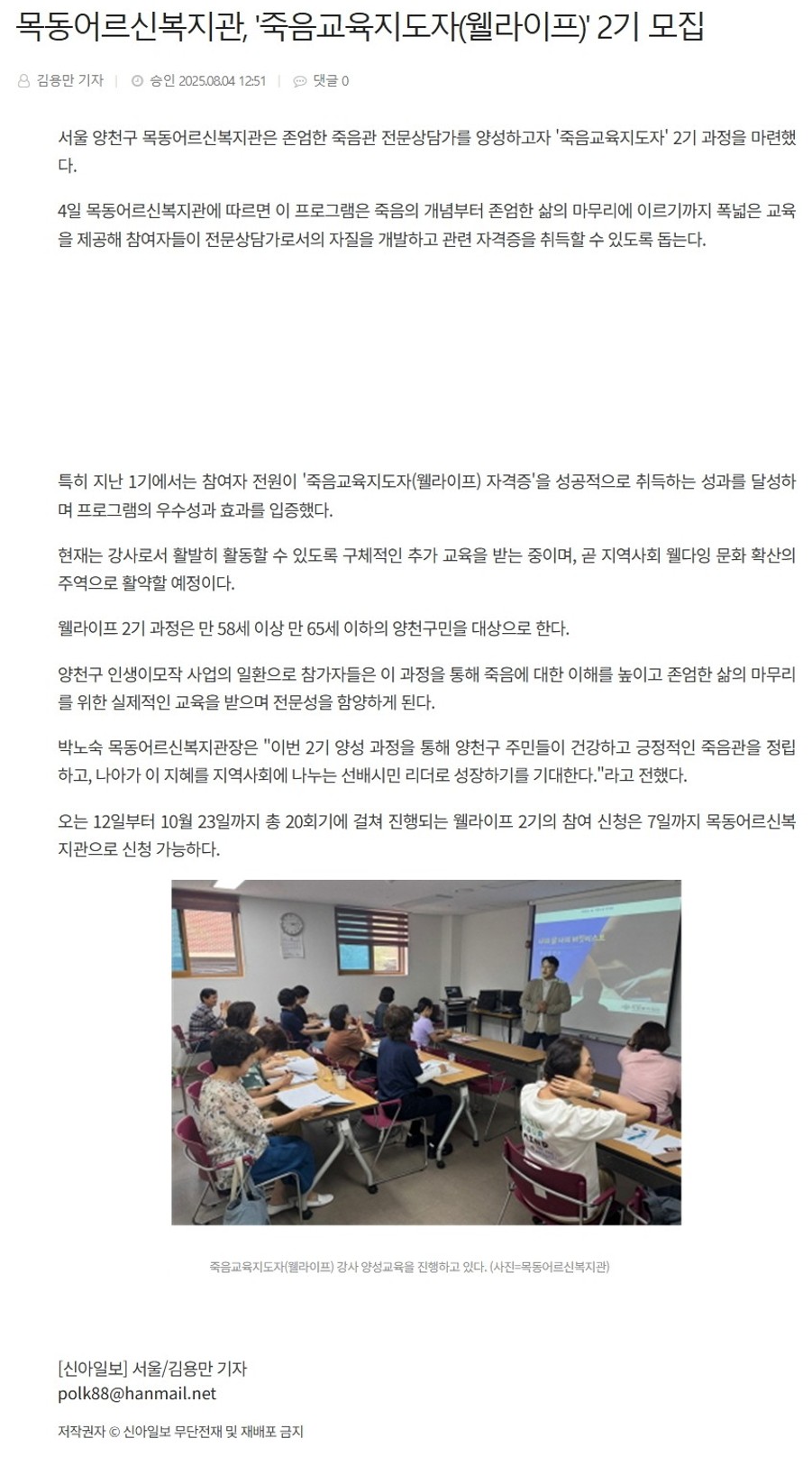목동어르신복지관, '죽음교육지도자(웰라이프)' 2기 모집