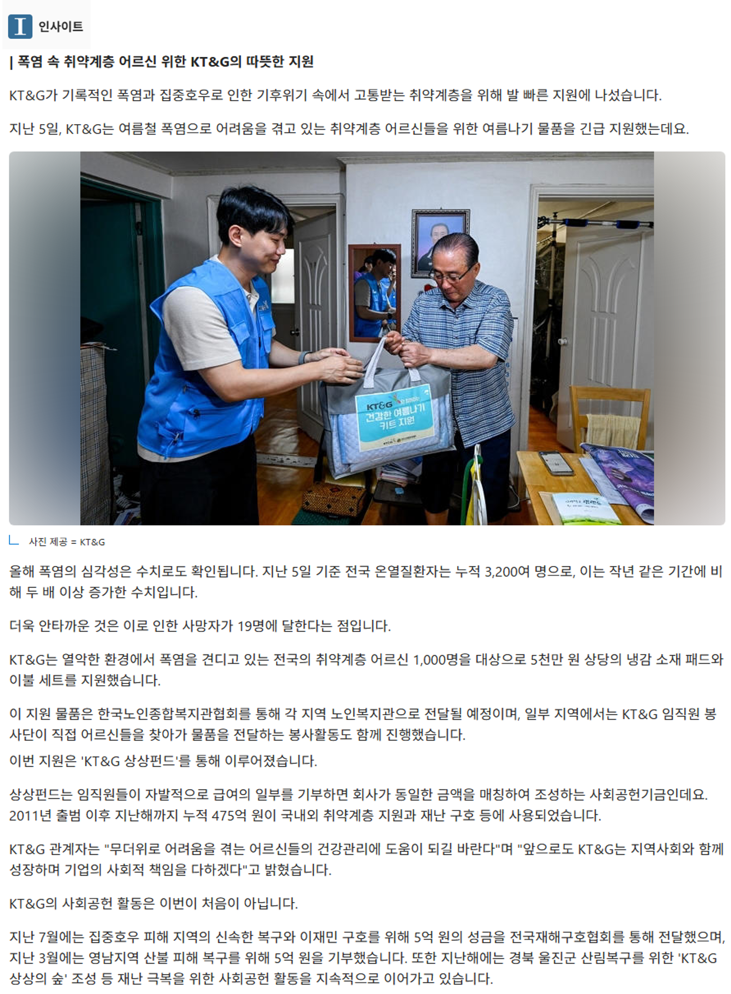 폭염 속 취약계층 구하는 KT&G, 5000만원 상당 여름나기 물품 지원