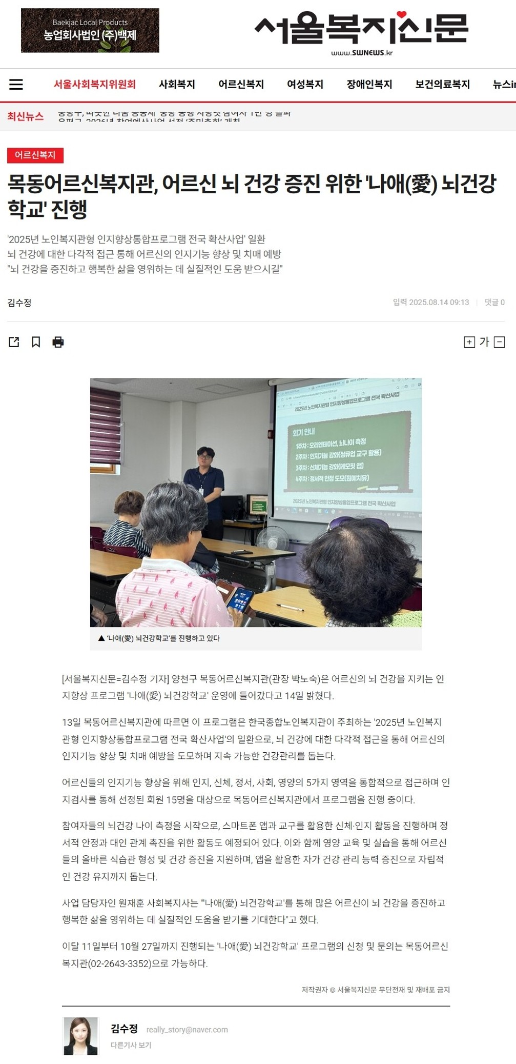 목동어르신복지관, 어르신 뇌 건강 증진 위한 '나애(愛) 뇌건강학교' 진행