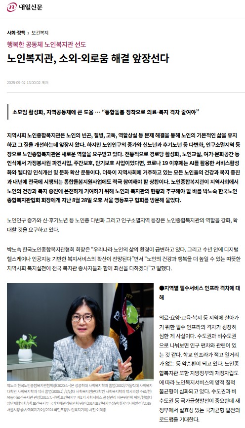 [내일신문] 행복한 공동체 노인복지관 선도: 노인복지관, 소외-외로움 해결 앞장선다