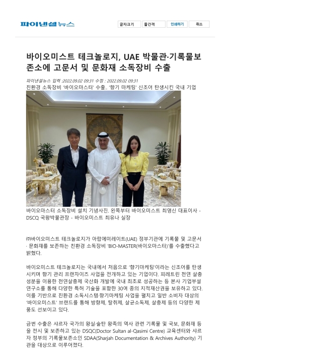 바이오미스트 테크놀로지, UAE 박물관·기록물보존소에 고문서 및 문화재 소독장비 수출